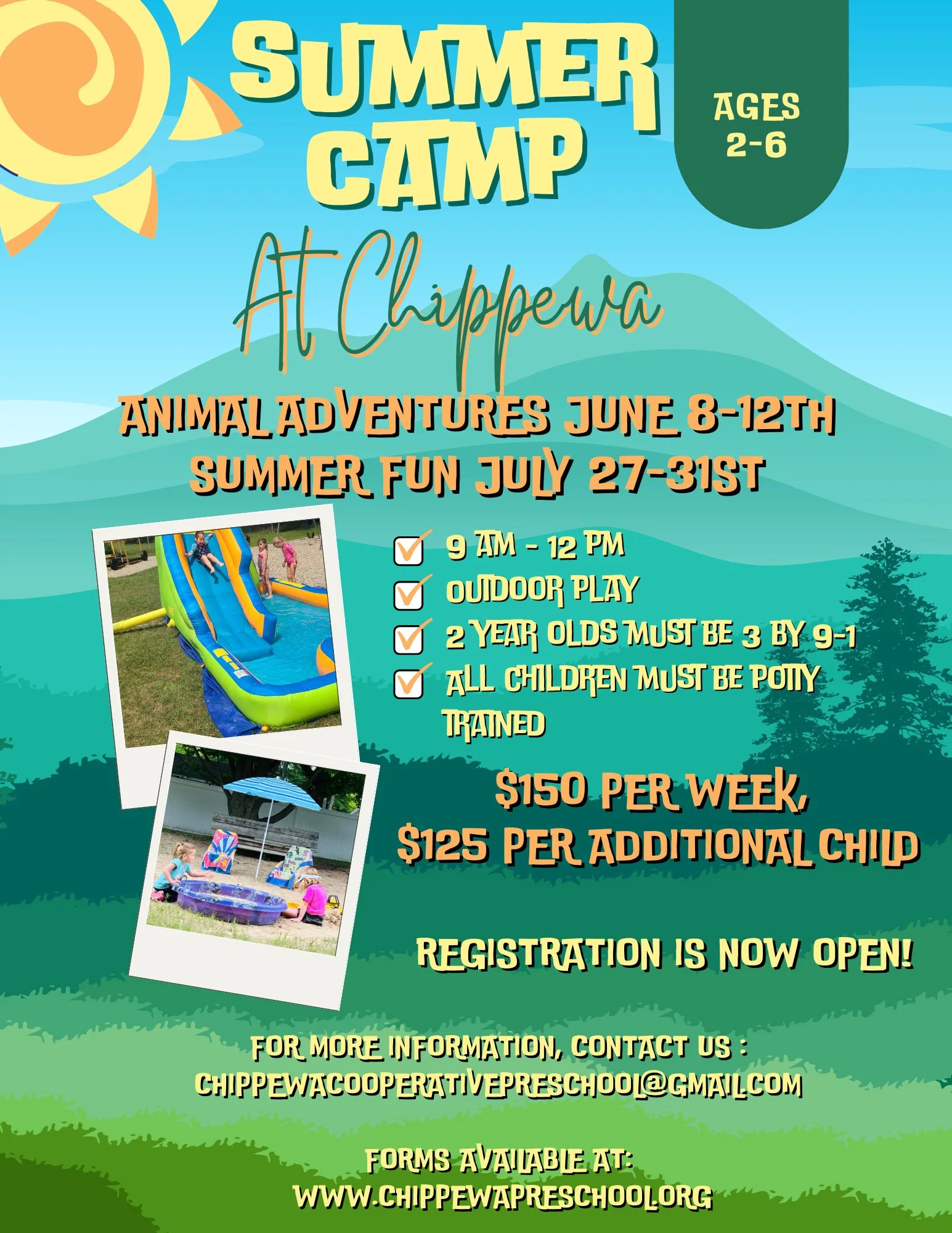 Chippewa Preschool is offering a summer camp for 2 to 6 year olds. Two-year-olds must be turning 3 no later than September 1st, 2025, and all children must be potty-trained. This program will provide outdoor*, age-appropriate activities, including art, music and movement, storytime, and snack.